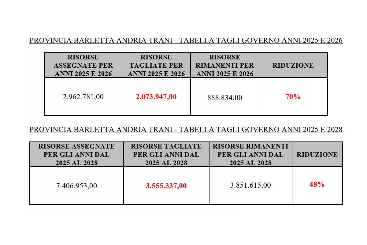 Grazie a questa energica sforbiciata del 70% dei fondi già assegnati a livello nazionale, la Provincia Barletta Andria Trani si vedrà sottrarre nel periodo 2025 – 2028 la somma complessiva di Euro 5.629.284,00, così come dettagliato nel prospetto che segue».«Come Amministratore Locale - conclude Lodispoto - non posso che ricordare a tutti Noi gli impegni assunti dal Governo a sostegno dello sviluppo socio economico delle comunità locali che, auspico non vengano dissolti e traditi con questa scellerata manovra finanziaria».