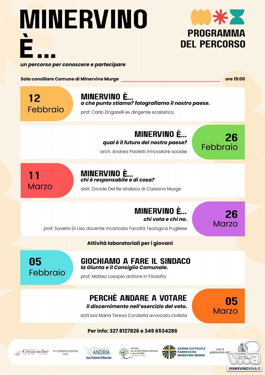 L'iniziativa, promossa da Cercasi un fine in collaborazione con l'Ufficio Diocesano Problemi Sociali e Lavoro, la Zona Pastorale e l'Azione Cattolica delle parrocchie di Minervino Murge, si presenta come un cammino formativo aperto a tutta la comunità, con particolare attenzione alle fasce giovanili. Il primo incontro, dal titolo "Minervino è… a che punto stiamo? Fotografiamo il nostro paese", sarà guidato dal prof. Carlo Zingarelli, ex dirigente scolastico, che accompagnerà i partecipanti in un'analisi condivisa della città.