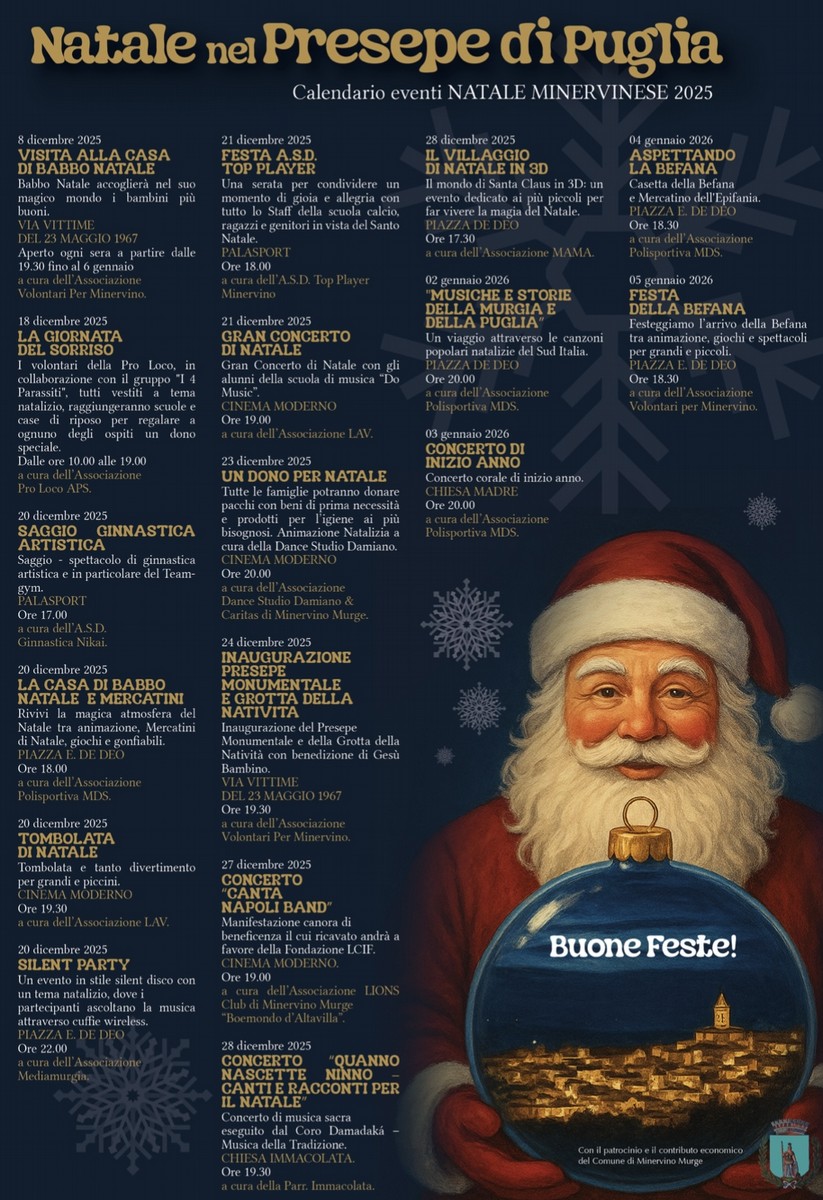 Il Comune di Minervino Murge ha dato vita ad un calendario ricco di appuntamenti ed iniziative pensate per grandi e piccoli, in occasione della stagione natalizia. Fino al 5 gennaio si alterneranno una serie di eventi realizzati dal Comune di Minervino in collaborazione con le associazioni del territorio.