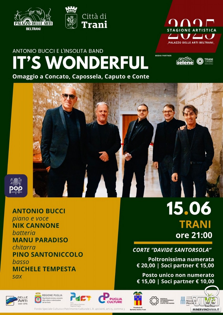 Domenica 15 giugno (inizio ore 21:00, porta ore 20:30) si accendono le luci su "It's wonderful", il caleidoscopico show di Antonio Bucci e l'Insolita Band, che cesellano le atmosfere del grande maestro Paolo Conte, il mondo magico del geniale Vinicio Capossela, il delicato lirismo del Premio Tenco Fabio Concato e l'ironico e accattivante swing dell'inossidabile Sergio Caputo. Biglietti: poltronissima numerata: 20,00 euro - poltronissima numerata per Soci Partner: 15,00 euro; posto unico non numerato: 15,00 euro - posto unico non numerato per Soci Partner: 10,00 euro. https://www.vivaticket.com/it/ticket/musica-a-corte-it-s-wonderful/263546